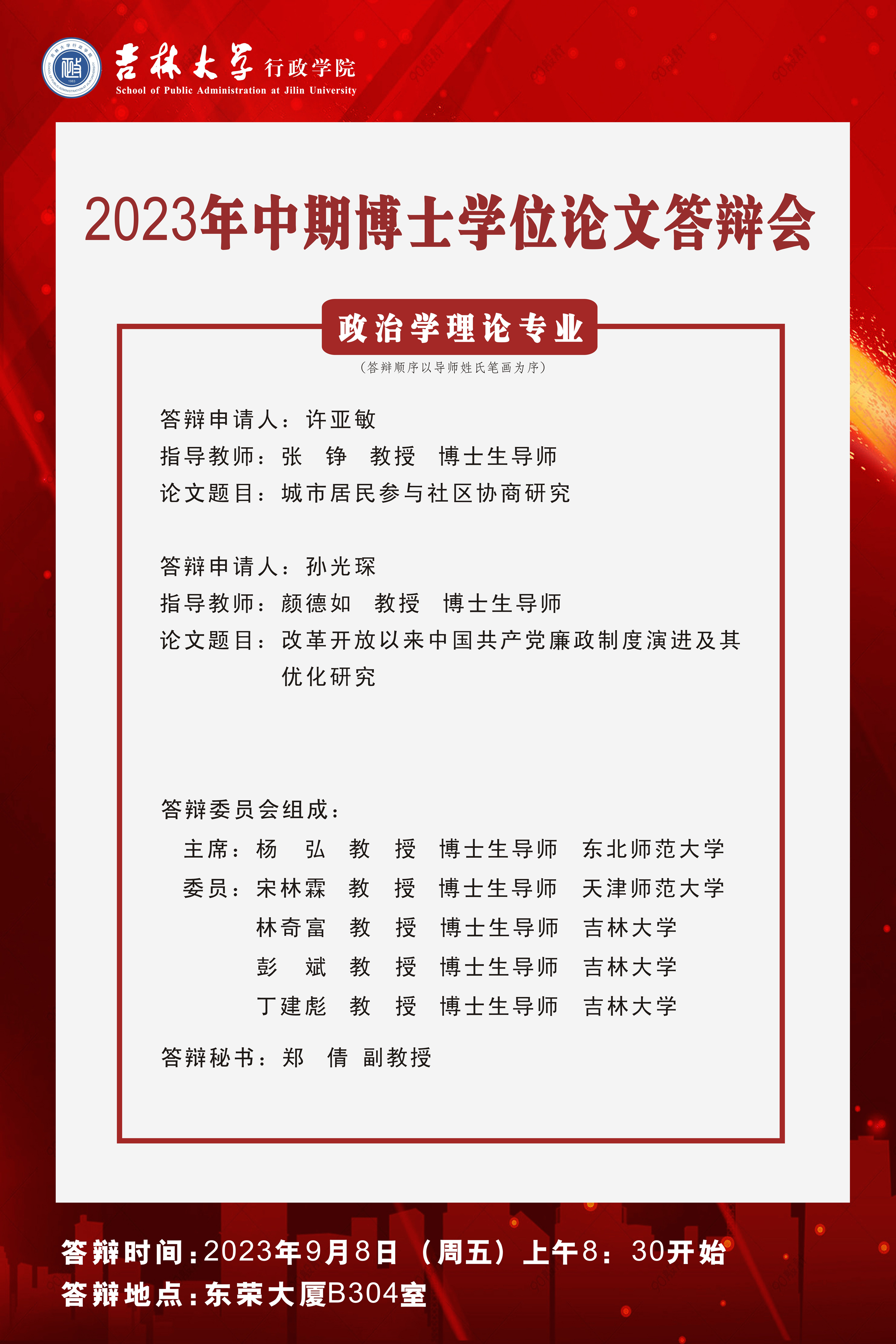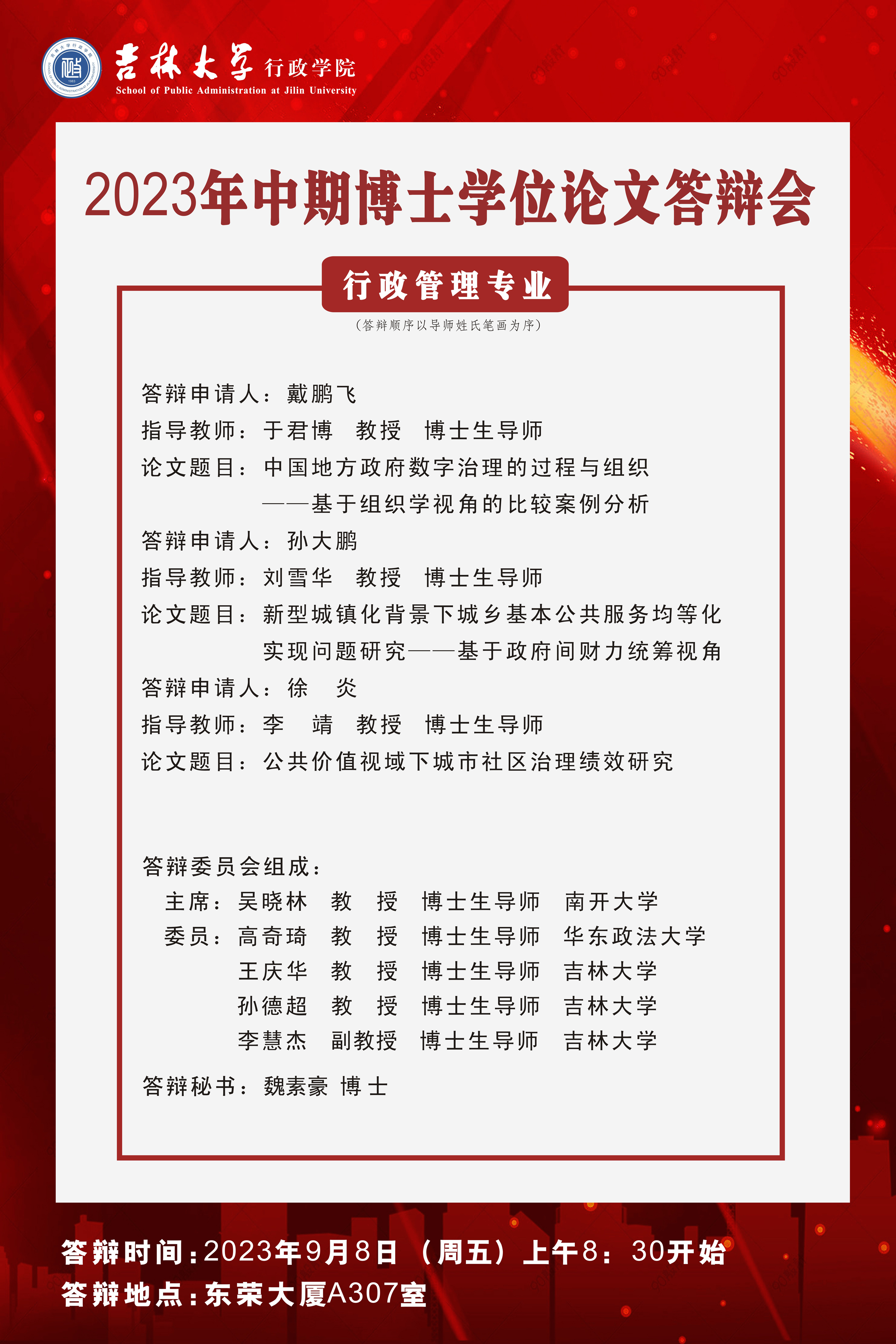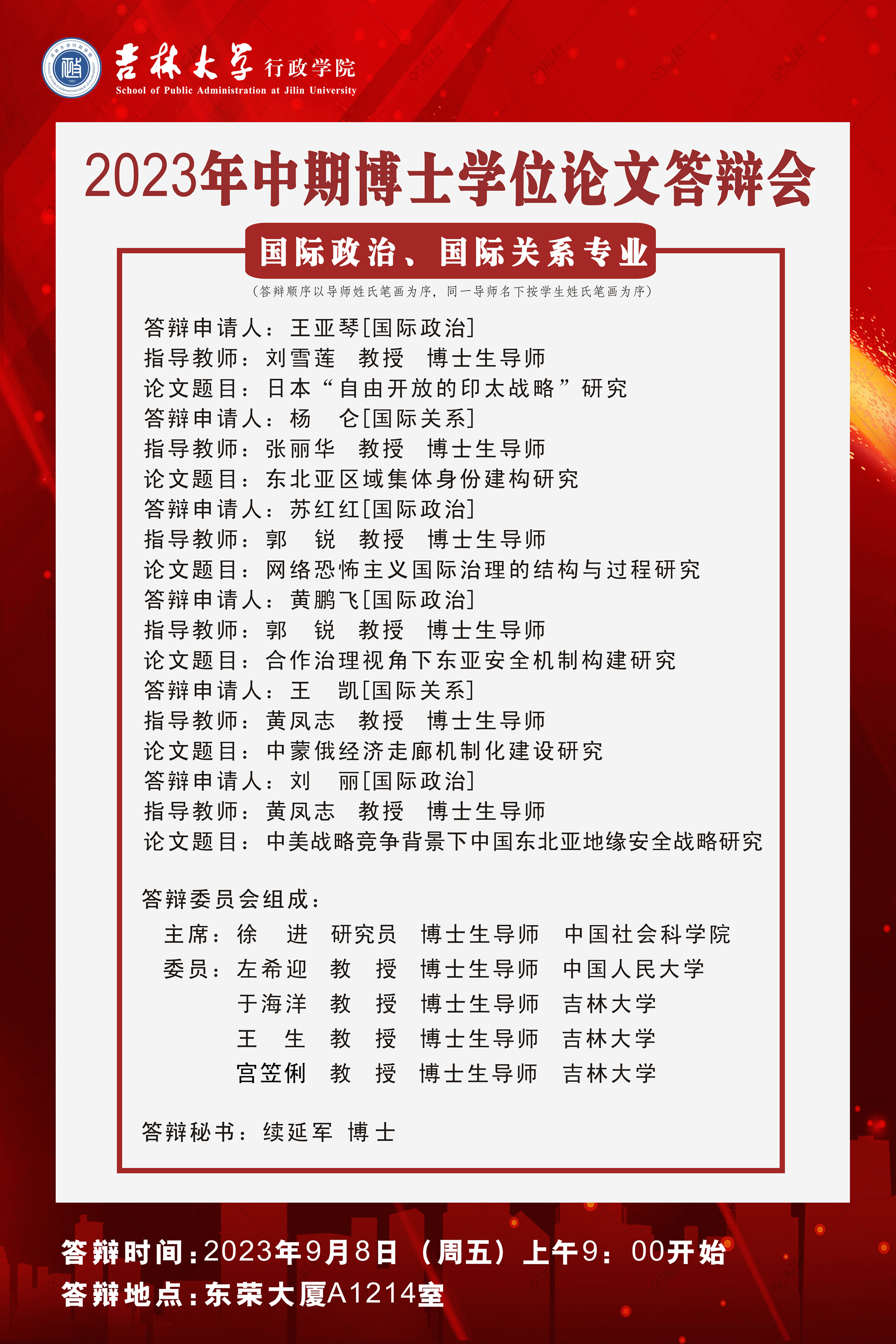 备注:原第三组答辩专家姚璐教授按照教育部要求,必须在规定时间(9月8日下午15:30)去外交部办理公派出国手续,无法参加答辩。经请示研究生院学位办公室,更换答辩委员为宫笠俐教授。