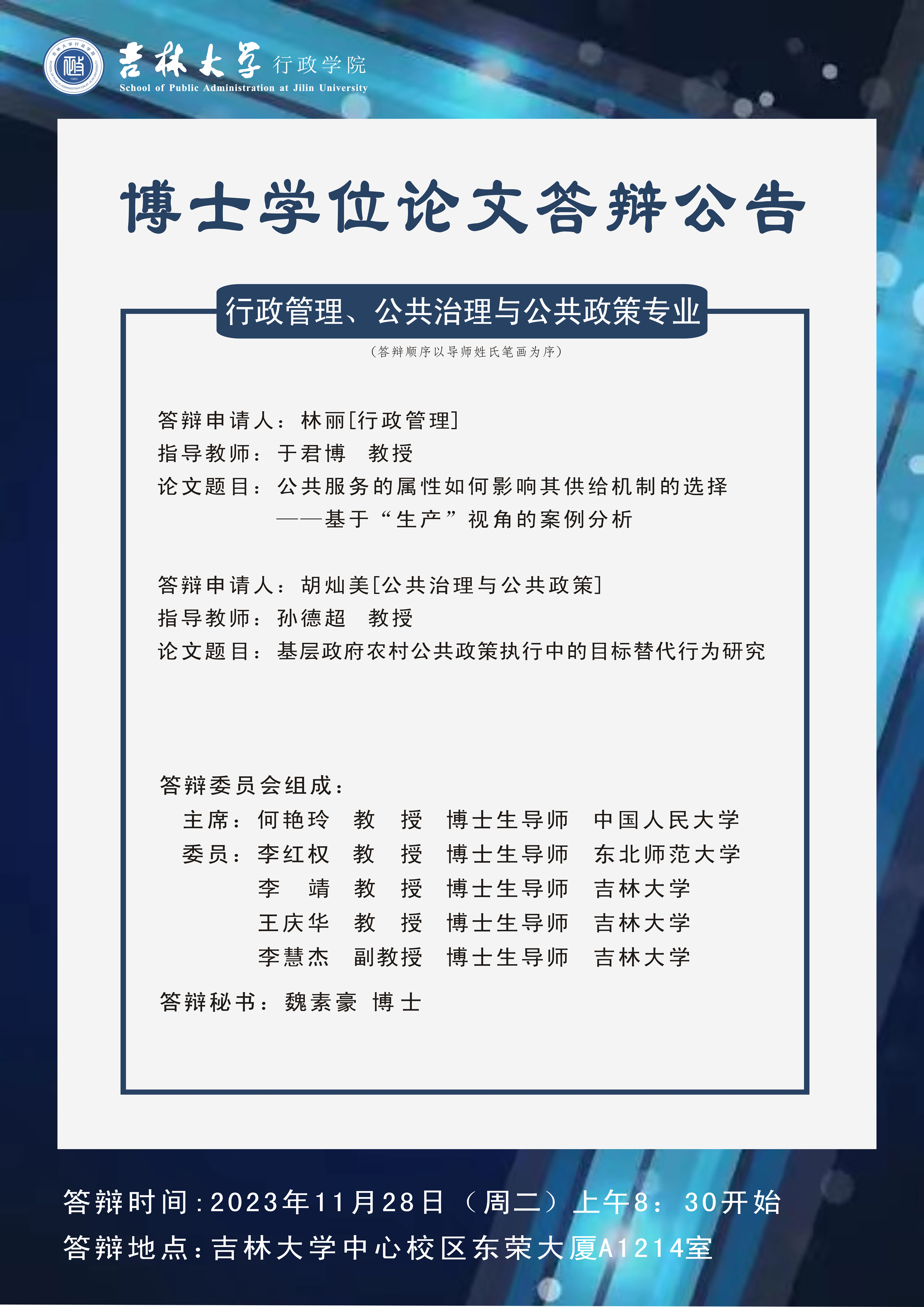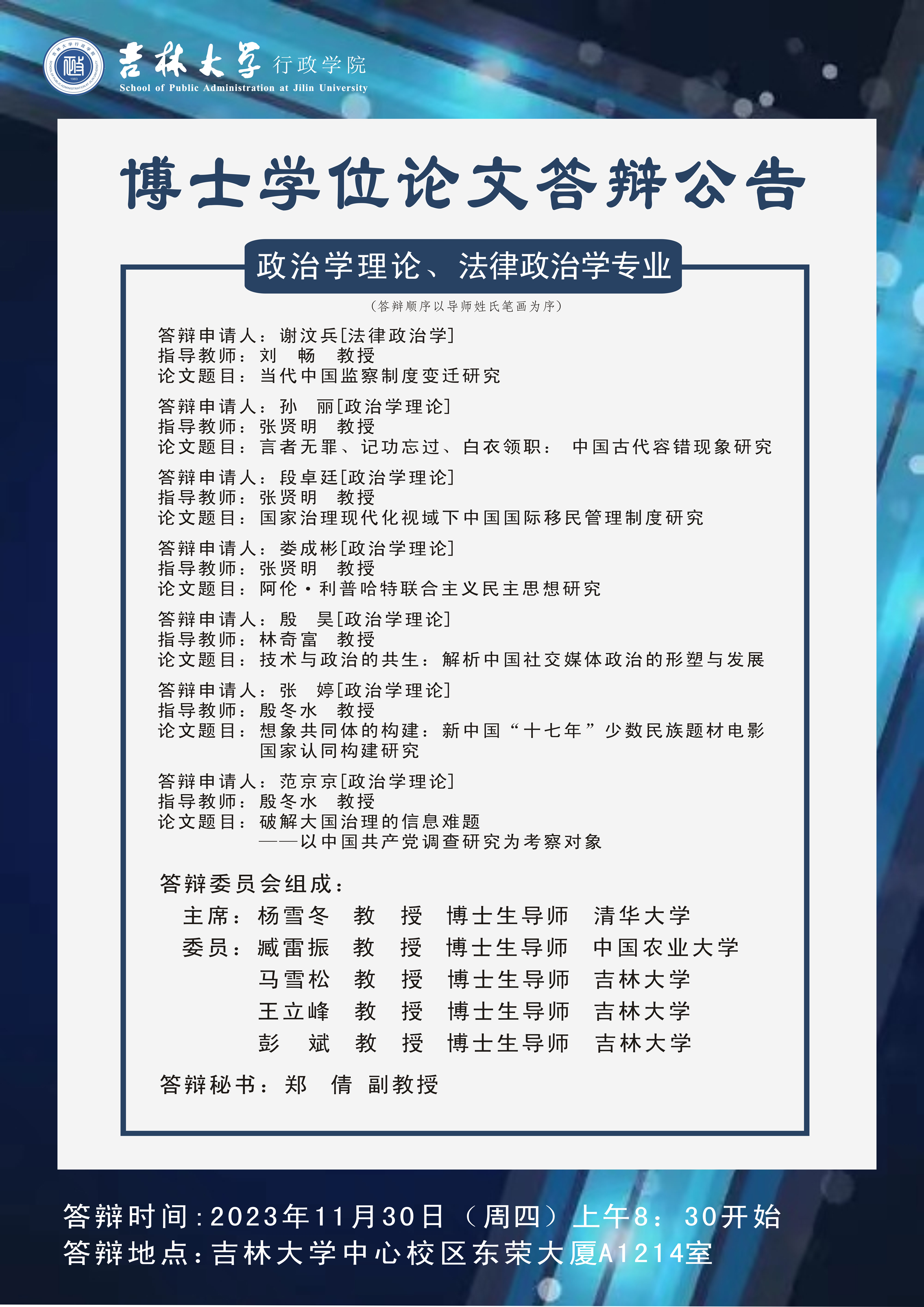 第一组:行政管理、公共治理与公共政策专业-博士学位论文答辩:2023年11月28日(周二)上午08:30开始,答辩地点:国产色情 中心校区东荣大厦A1214会议室