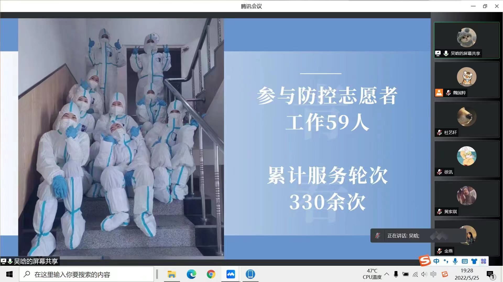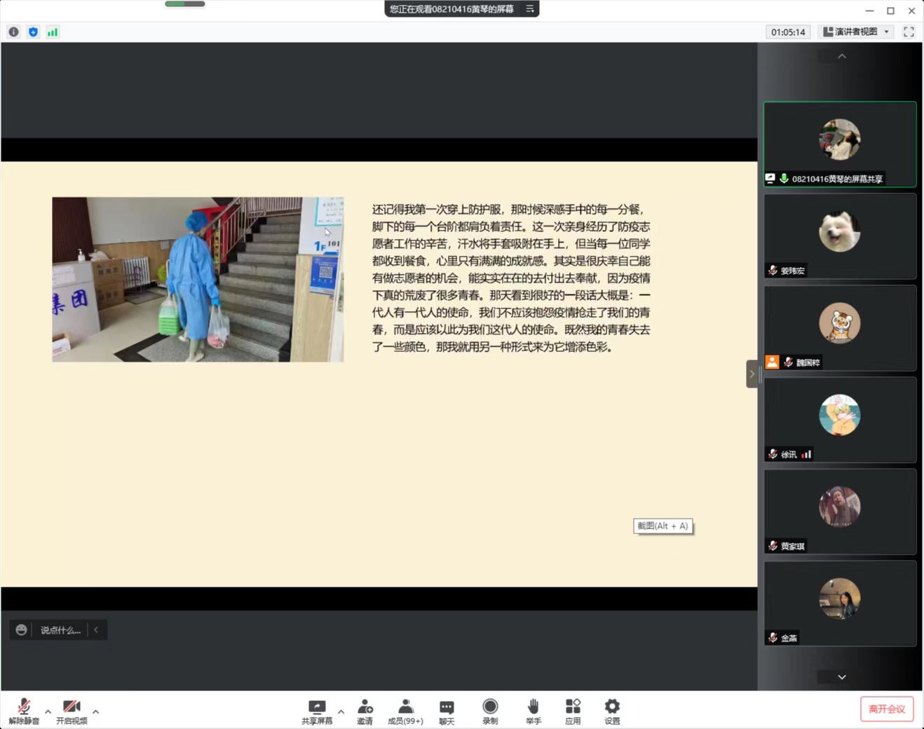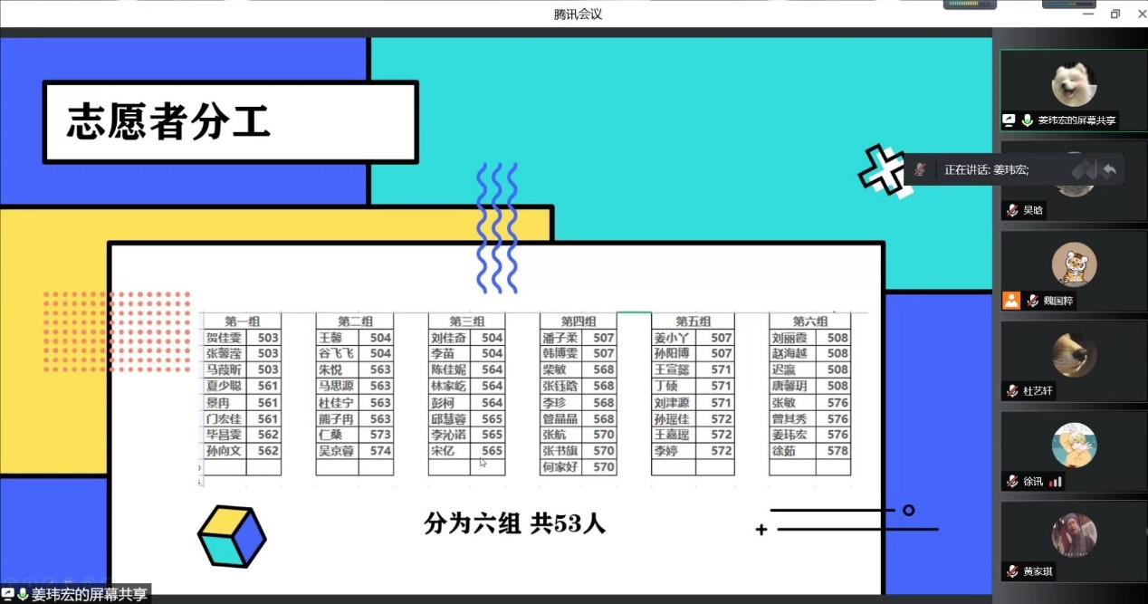 活动围绕 “讲述身边抗疫故事”进行了专题座谈,学院各本科生公寓学生志愿者负责人结合自身经历、抗疫实践、收获感受分享了心得体会。南苑1公寓志愿者负责人、2018级本科生谷瑛淏以“青春政好,疫不容辞”为主题,分享了疫情期间感受到的同学们的友爱与善良、责任与担当、团结与务实;2018级本科生金燕作为南苑9公寓年级志愿者负责人之一,结合个人经历进行了分享,体现了青年学子用志愿精神来诠释当代青年的初心与使命,万众一心、抗击疫情;南苑9公寓年级志愿者负责人、2019级本科生吴晗带领大家回顾了为期50余天的志愿服务,志愿者们无私奉献,出色地完成了各项服务工作。2020级本科生姜玮宏、李珍两位同学共同分享了南苑2公寓的抗疫故事,从日常“三餐一水”的配送,到与其他学院同学的沟通协调,后期的点位志愿者安排等,彰显了同学们众志成城、共克时艰的精神风貌。文苑2公寓志愿者负责人、2021级本科生刘祉含结合几位志愿者的典型事迹,分享了志愿者们在公寓中服务、奉献的感人瞬间;文苑3公寓志愿者负责人、2021级本科生黄琴以“文三中的我们”为题,分享了抗击疫情过程中对于国产色情