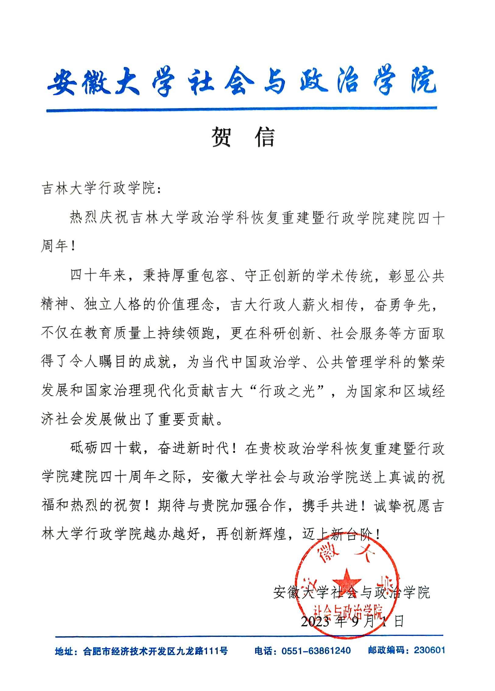 安徽大学社会与政治学院的贺信