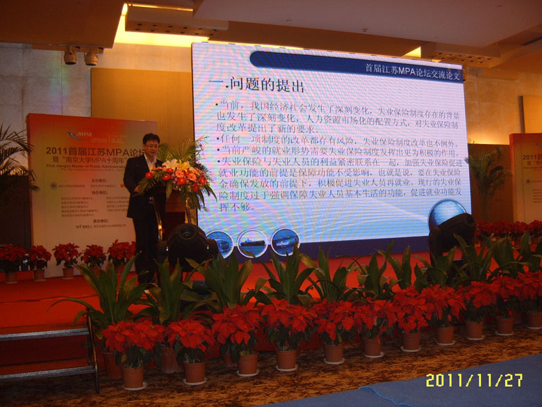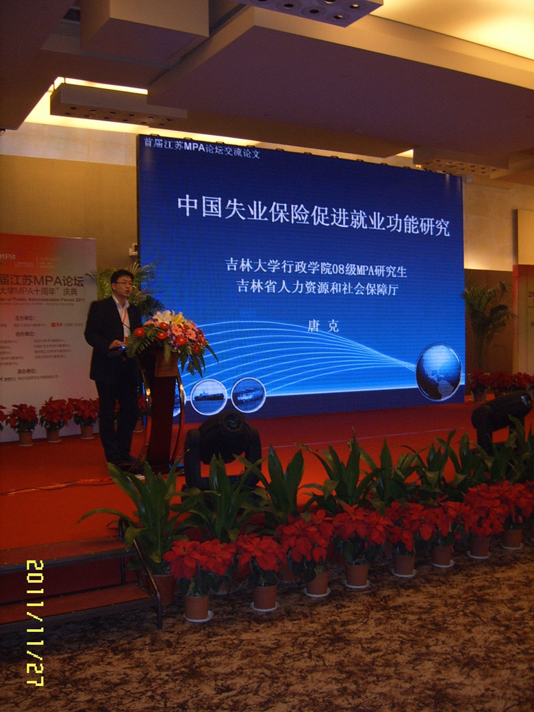 2011首届江苏MPA论坛议题主要有三项:一是促进就业与构建和谐劳动关系;二是如何解决中小企业融资难困境;三是如何以社会管理创新推进和谐社会建设。唐克同学和张斌阳同学的论文被收录到首届江苏MPA论坛论文集,唐克同学还在论坛上做了主题为“中国失业保险促进就业功能研究”的演讲,受到与会领导和MPA同仁们的一致好评,为国产色情