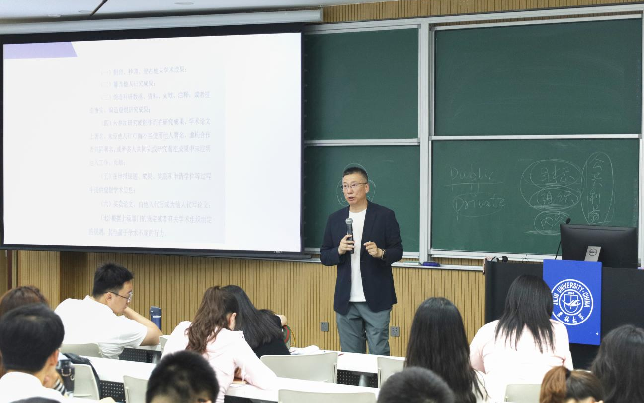 作为首批公共管理硕士(MPA)试点单位之一,具有系统的培养方案以及绝对的优势资源,呼吁大家利用好学校资源及平台,结合自身学习偏好和工作实际做好理论与现实案例的分析。接着,刘雪华针对科学道德和学术规范问题与同学们进行了讲解,从违背学术道德的表现、危害以及如何践行学术规范等多个方面展开了深度论述,希望新生能够秉承永攀高峰、敢为人先的学术责任,做追求卓越的行政人。